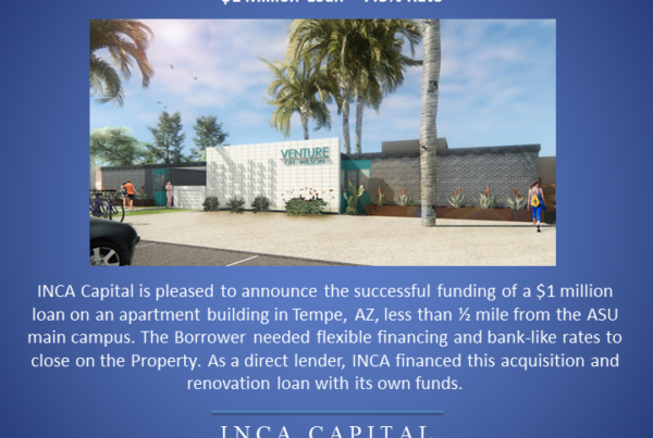 INCA Capital has funded a broad and diverse number of private loan transactions for its clients which have included: secured real estate loans, mezzanine loans, participation loans, joint venture structured arrangements and special purpose business financing. INCA Capital has funded more than 1,000 loans exceeding $2 Billion. Below are a few transactions representing those loans.